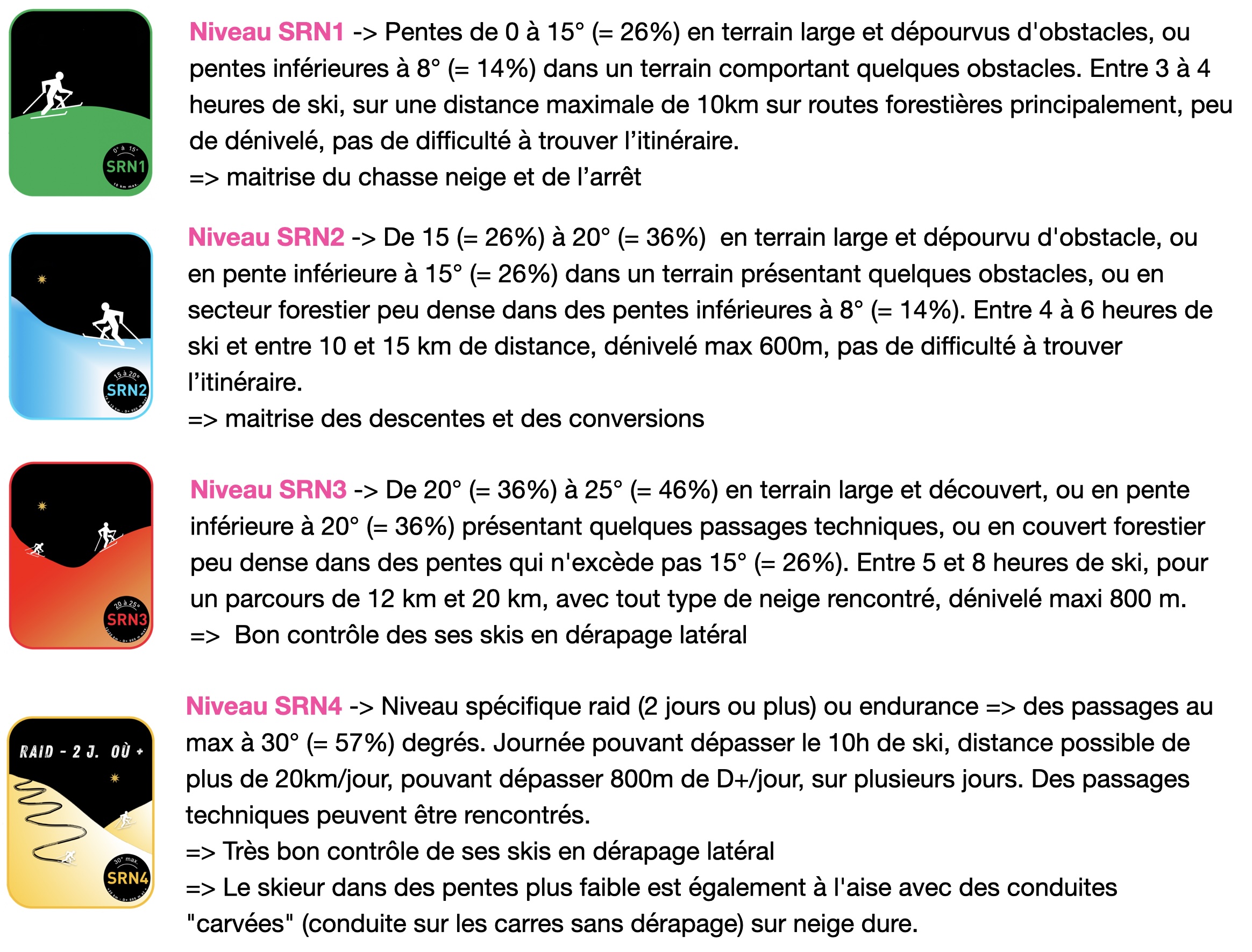 Actualités > Ski de Randonnée NordiqueAfin de contribuer à son développement les clubs alpins pratiquant le SRN se sont accordés pour adopter un système commun de cotation pour leurs sorties. Un pas important pour structurer la pratique en club et contribuer à sa promotion !