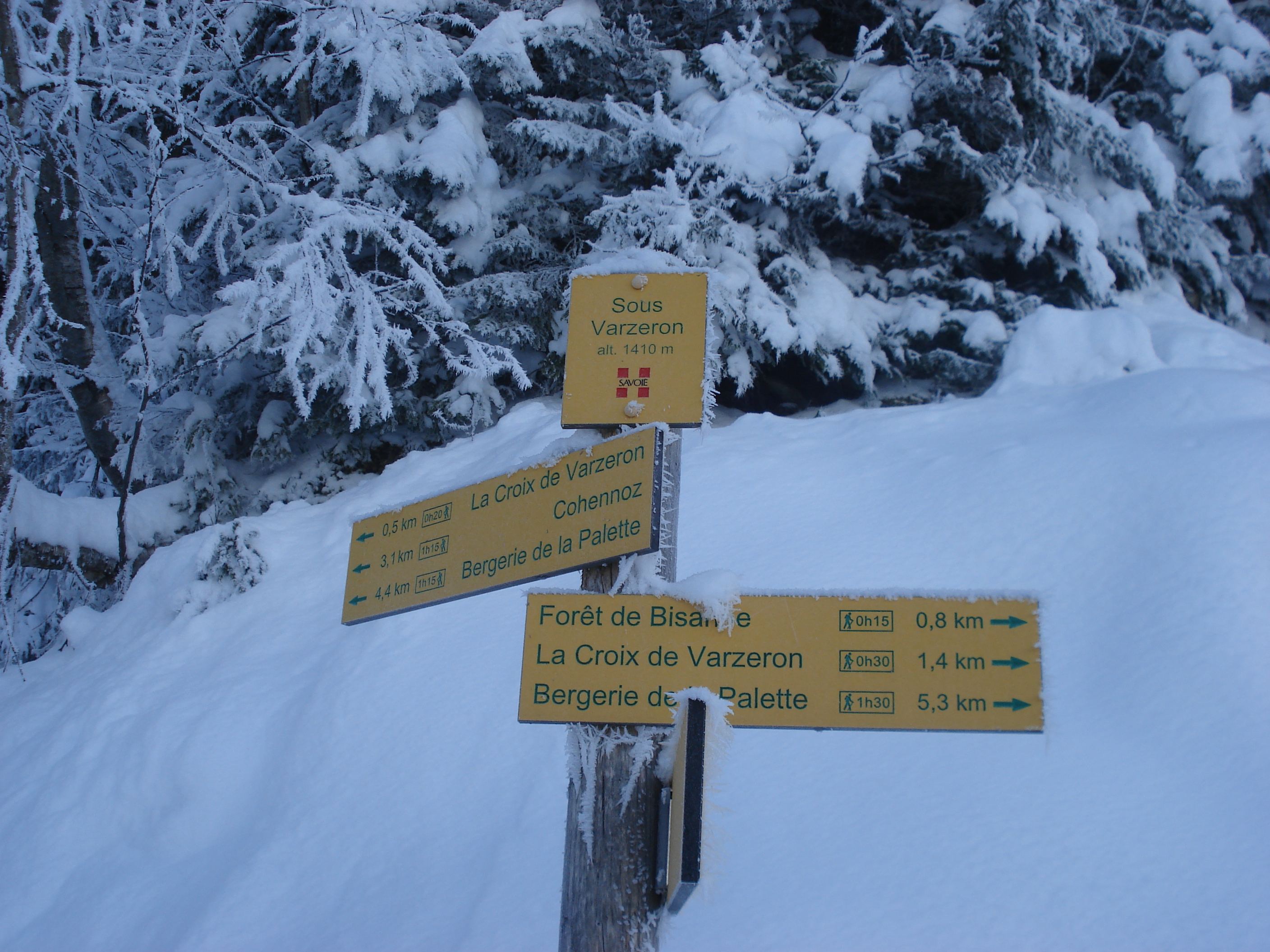 Départ au point côté 1456m, 800m SE avant la station de Bisanne 1500. L'itinéraire suit vers l'ouest la route forestière horizontale des Orseraies, passe au point 1456 (et descend ensuite sur 5km environ jusqu'à les Mouilles (1152m panneau Val d'Arly) ou il prend vraiment le cap vers l'Est sur une belle route forestière. Elle traverse le nant de Boulou et va s'appeler "route du Manchu". Après une première épingle, on arrive à une bifurcation avec les indications à droite Lac des Saisies ou à gauche Croix de Varzéron -Bergerie de la Palette. Si on rejoint le lac des Saisies et la route de départ la sortie va faire 12 km. Il est possible de se laisser tenter par un aller retour de 4,4km jusqu'au télésiège des Chamois près des pistes de nordique des Saisies. Je l'ai fait et vu la poudreuse froide qu'il y avait ce jour ce n'était pas désagréable. A noter que si on a positionné une voiture au col des Saisies il est possible de terminer la rando à cet endroit. Intérêt de la sortie : la solitude si l'on excepte le secteur du lac - les vues panoramiques sur le Beaufortain - Mirantin d'abord, sur la Combe de Savoie puis quand on a changé de versant, sur Ugine, les Aravis, le bas Val d'Arly (du Mont Charvin à la Pointe Percée). La partie la plus difficile en descente est le retour du lac des Saisies jusque sur la route des Orseraies 700m de longueur environ. Elle est toujours pistée par les raquettes et peut donc se faire à pied.