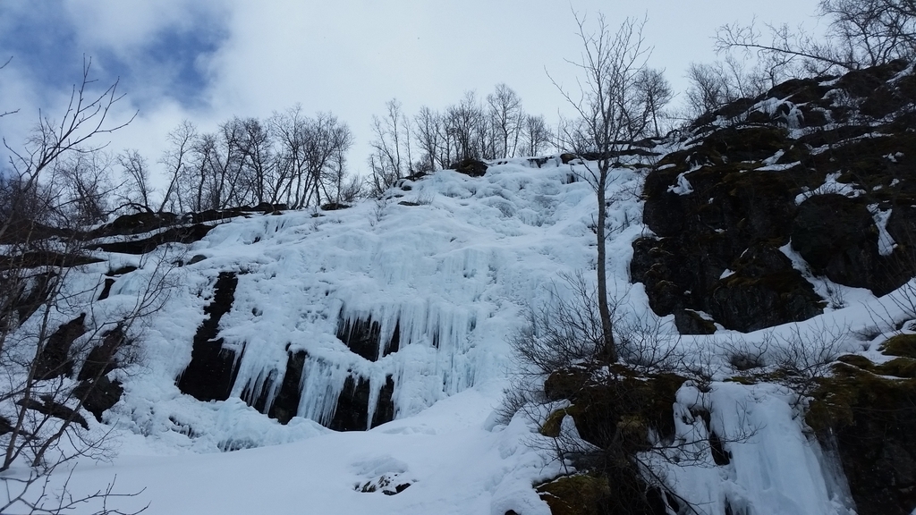 Au retour, je vous conseille d’emprunter le chemin de l’aller, sachant que la section entre les 2 lacs est impraticable et qu’il y a une rivière à traverser (et de belles descentes entre les bouleaux et les rochers….) Faites ce que je dis, pas ce que je fais, parce que j’eu une envie irrépressible de me plonger dans l’eau froide et pure de la rivière qui relie les lacs de Reinungavatnet et Seltuftvatnet. Je confirme, les Svartisen 75 mm ne sont pas insubmersibles, mais toutefois sont très protectrices. Après cette minute d’aventure, j’ai rallié tranquillement Vatnahalsen en skiant au milieu du lac Reinungavatnet.