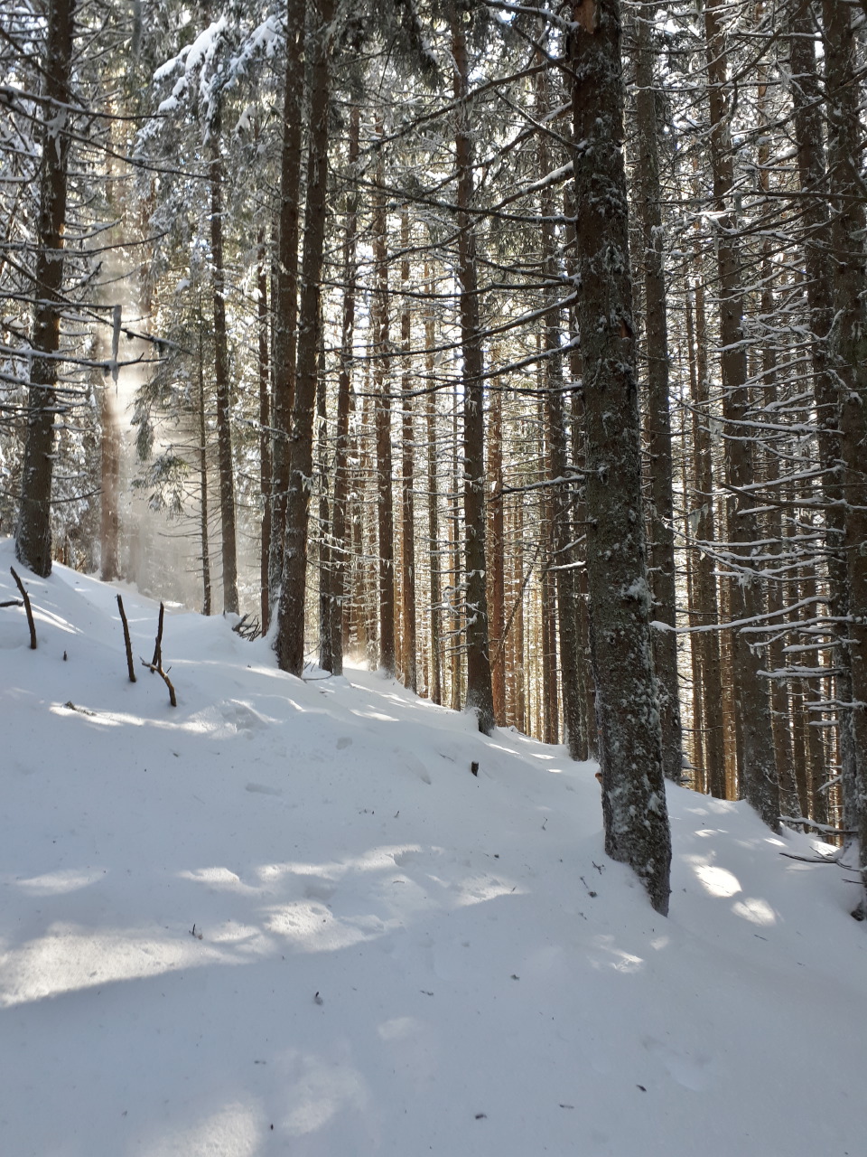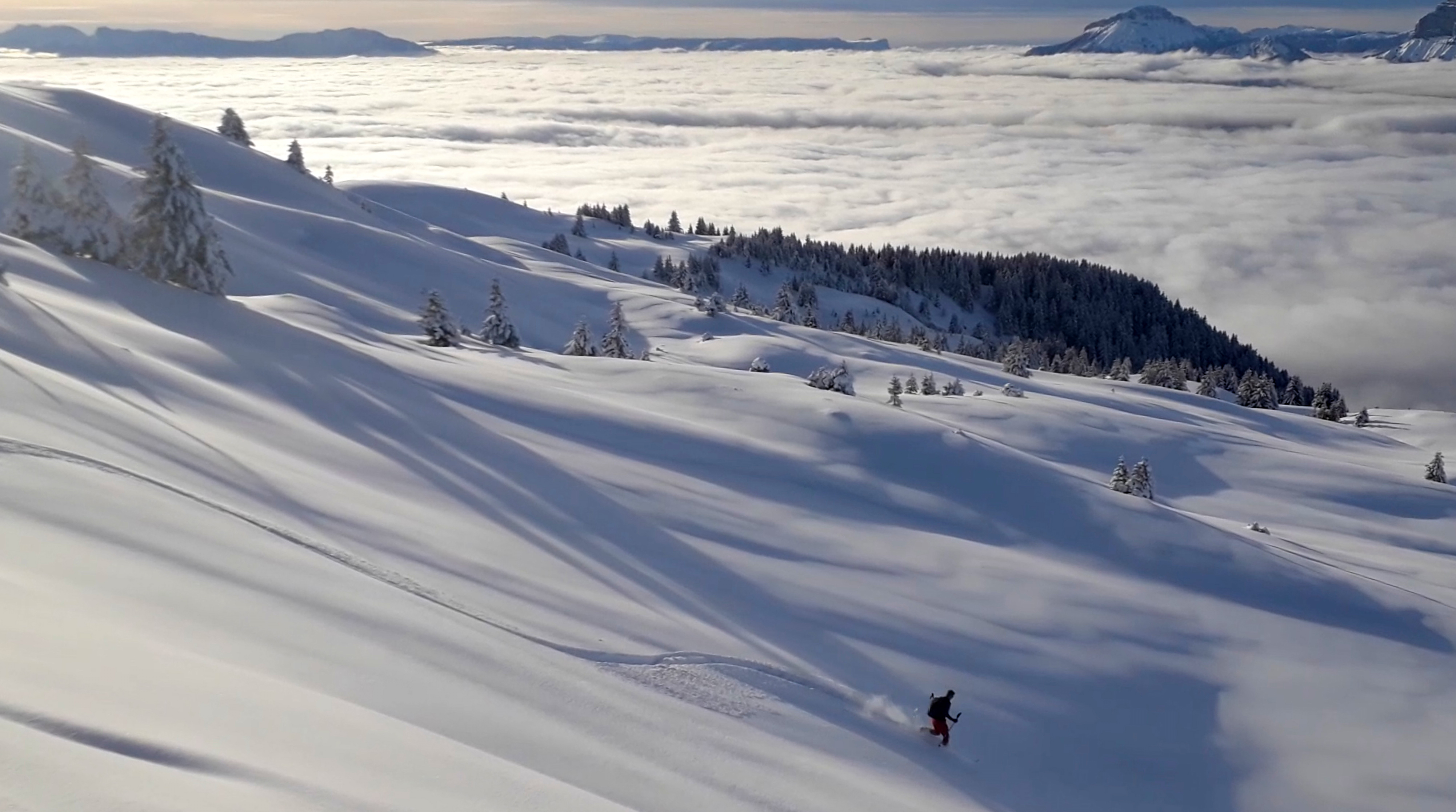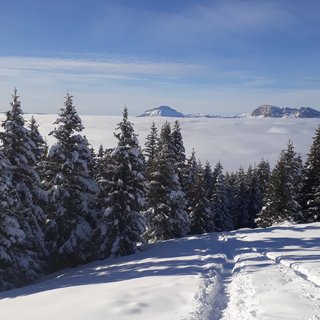 Départ du parking de Pipay dans le brouillard pour émerger au dessus de la mer de nuage dans une poudreuse de rêve. On suit les traces des raquettes et ski de rando au maximum avant de faire une incursion dans la poudreuse.