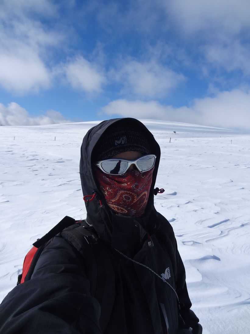 Après manger je traverse la route en slalommant entre les gravillons de pouzzolane (PNR oblige = pas de sel, enfin j'espère!) et redescends vers l'Ance au niveau du ruisseau du grand genêt : enchainement de quelques virages télémark pas trop mal négociés (photo 2), c'est-à-dire que je n'ai pas goûté la neige à cette endroit! :) Content le débutant! Puis montée en trace directe vers les Jasseries de Pégrol : le valon est magnifique pour la montée (photo 3)! Et abrité du vent. Par contre en haut ça décoiffe. Redescente au niveau des sources de l'Ance via la grange sans nom, puis remontée vers le GR entre la croix de Barras et la goutte noire. Direction Pierre Bazanne après une petite pause au Plan Chevalat, et trace directe vers le Sichard avant de rejoindre l'auto.