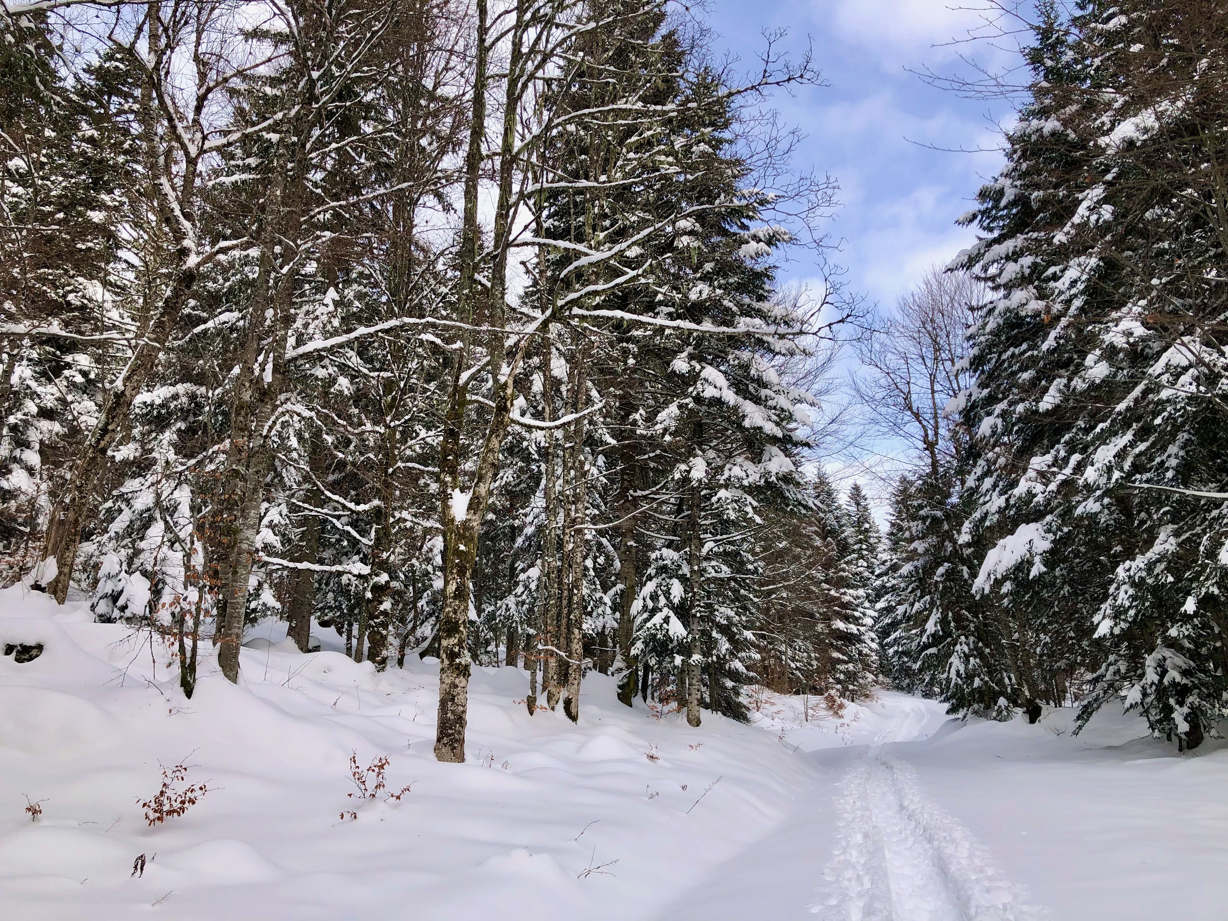 A 9h, nous sommes sur le parking du Pont des Allemands, à quelques hectomètres du musée de la Corderie. La neige est effectivement bien là en quantité. Nous chaussons les skis et partons tout guilleret en direction du monastère. L’ambiance est féérique. Noël approche, mais le cadeau est déjà là ! Les conifères, malgré le vent de la veille, ont encore les branches chargées.