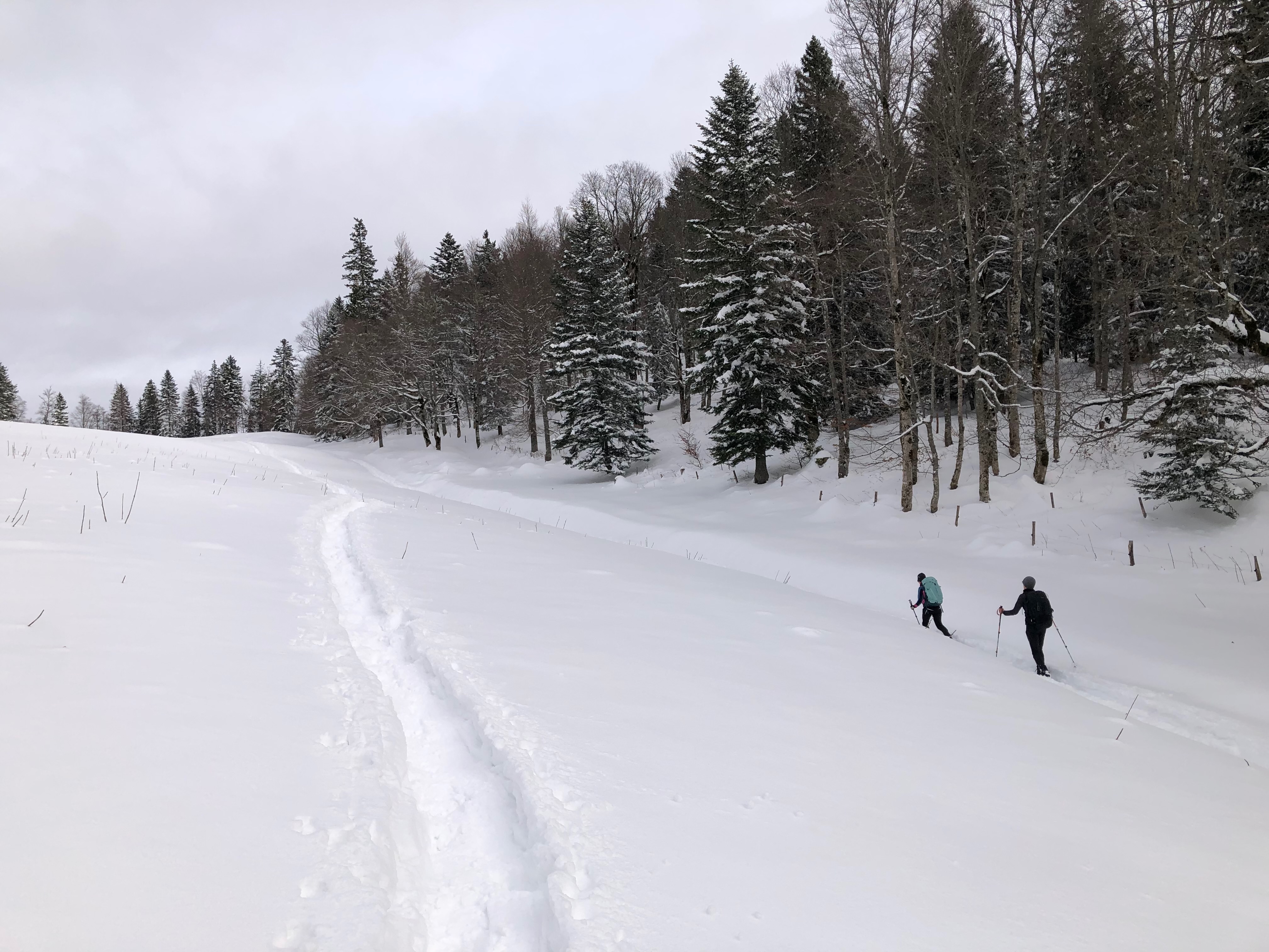 Arrivée au col de la Ruchère (1418 m), nous rencontrons les premières personnes de la journée. Nous en profitons également pour déjeuner avant de parcourir les belles pentes de la prairie du col. La neige malheureusement a transformé et elle forme quelques bottes sous nos semelles. Malgré tout, nous parvenons à réaliser quelques génuflexions de telemark en l’honneur des moines des lieux.