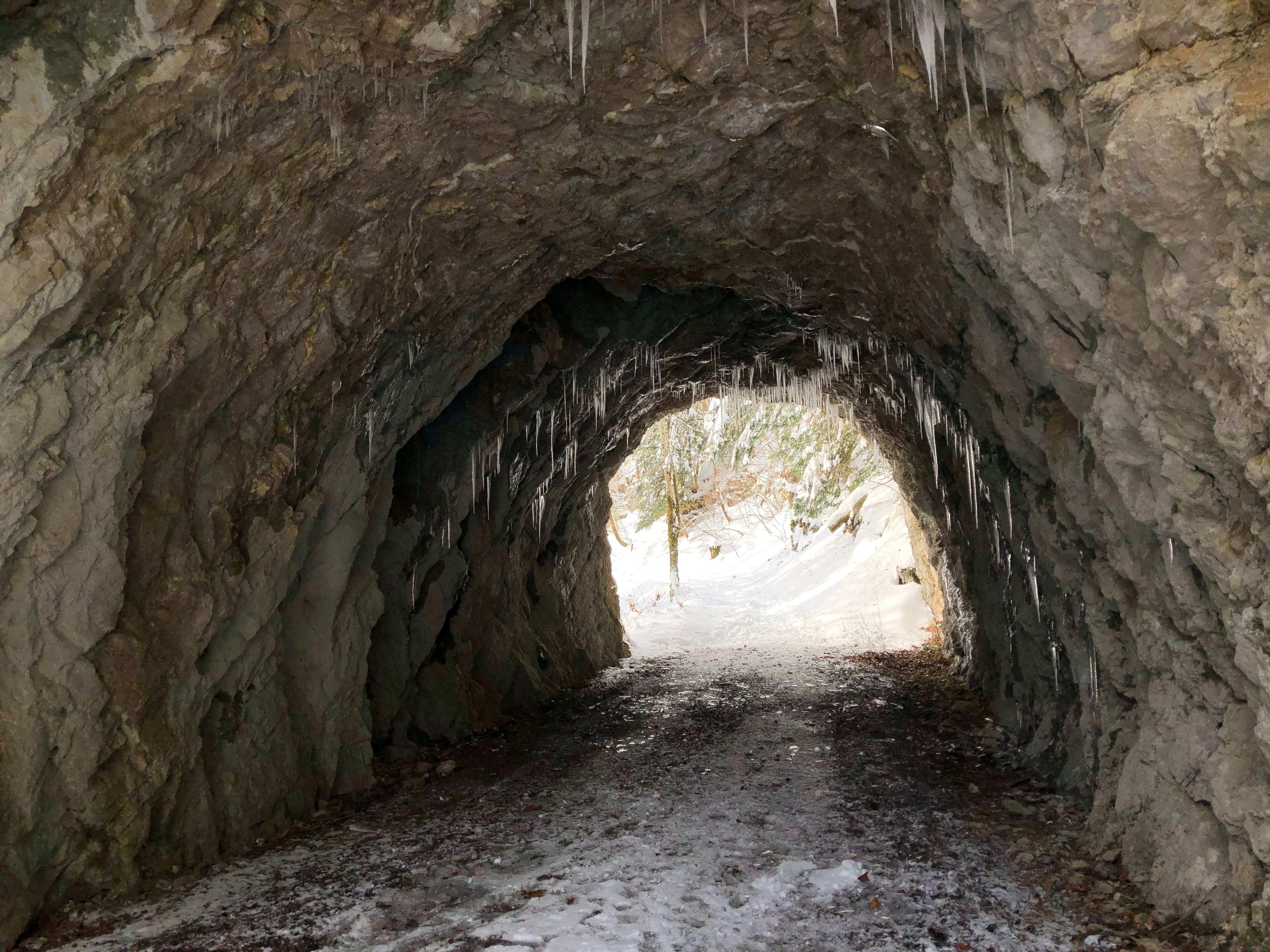 Petite particularité de la piste forestière, un petit tunnel qu’il nous faut traverser sous les augures de belles stalactites de glace. Fort heureusement pour nous, aucune ne se décrochera à notre passage.