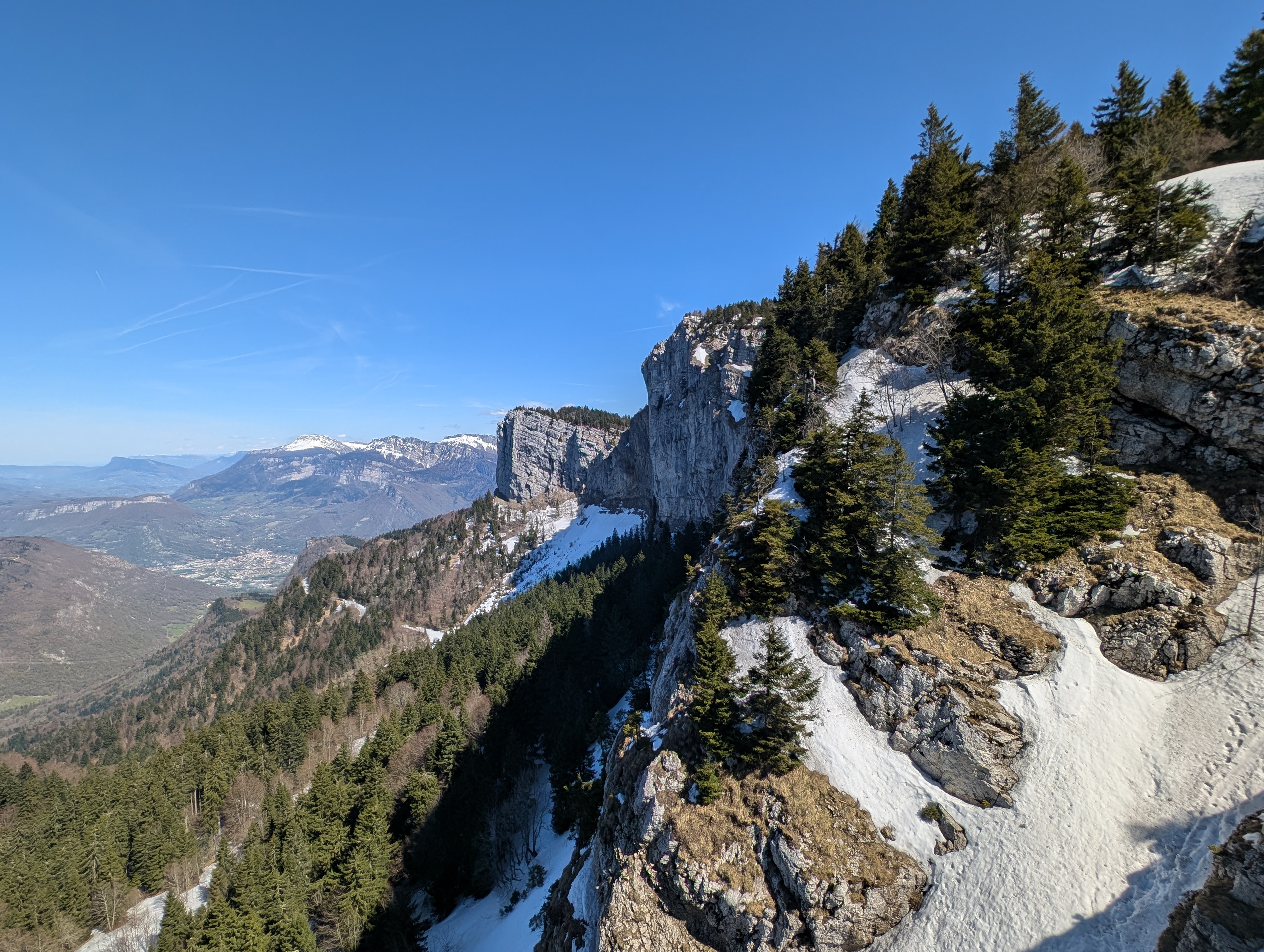 Une sortie en allez-retour permettant de profiter de cette neige de printemps et le panorama qu'offre le point du vue du Pas de la Clé (1510m). Ici nous sommes a l'extrême nord du Vercors. Le Belvédère offre une vision sur le massif de la Chartreuse, la cluse de Voreppe, le début des Chambaran et ces villes et villages alentours : Tullins, Moirans, Voiron...