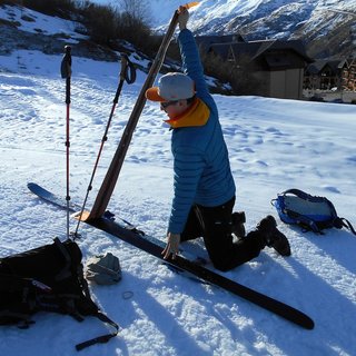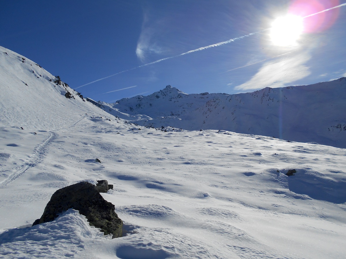 Départ du front de neige de Valmeinier 1800 par la piste de ski des Inversins (enneigée artificiellement) qui remonte vers le télésiège éponyme. Lorsqu'elle oblique à gauche, on poursuite par un chemin partant sur la droite (il faut contourner la barrière qui le ferme) en direction du Vallon des Marches qu'on remonte jusqu'à environ 2490m. On s'arrête là, sous le Col des Marches, faut de temps pour poursuivre plus loin, mais on y reviendra car le secteur offre de belles possibilités.