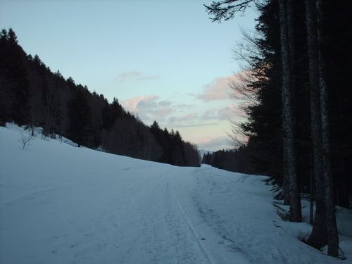 La trace grimpe le long de cette longue ravine; le chemin est droit, encaissé entre de petites falaises, parsemé de quelques sapins: il donne l'impression étrange, avec le soir qui tombe doucement sous ce ciel de coton, d'un long tunnel de neige grimpant vers un autre univers, qui referme doucement ses bras de roche sur l'aventurier de passage, ne lui laissant d'autre choix que d'avancer ou de rebrousser chemin.