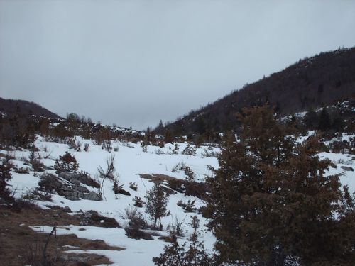 Je m'engage dans la Combe Libouse, un vallon encaissé entre deux collines boisées, et le manque de neige lié à l'altitude commence à se faire pénible. Depuis le matin, j'ai pu ruser et contourner de vastes zones herbues et caillouteuses pour ne pas endommager mes skis ou ma pulka, mais la neige disparaît de plus en plus. Je dois parfois me déharnacher et partir à pied, loin en avant, reconnaître la piste. Plus aucun traineau ne pourrait passer maintenant, car les zones de sol affleurant sont trop nombreuses.