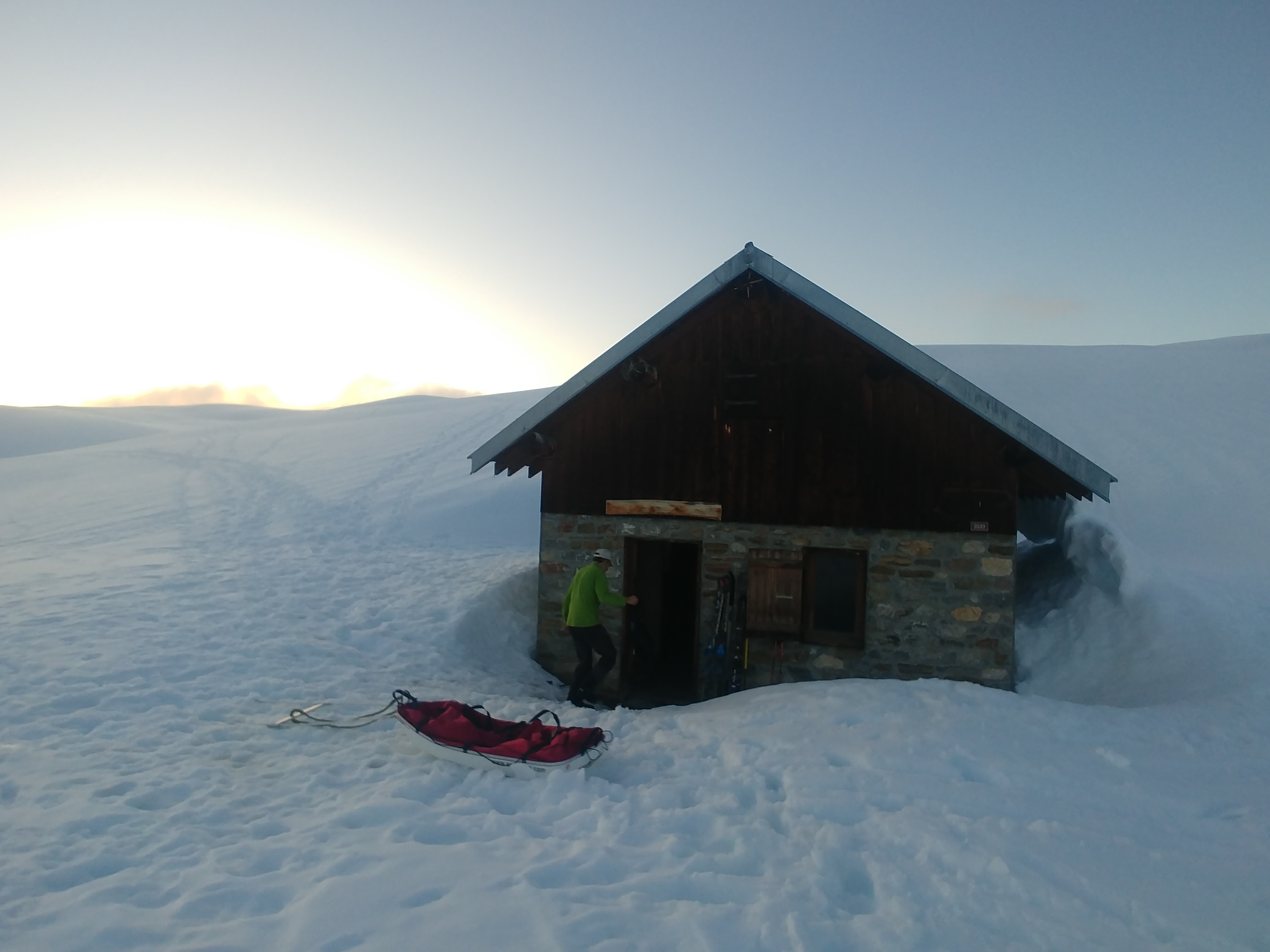 Après une bonne nuit, nous repartons en direction du passage de Bozon puis contournons les pentes abruptes du Quermoz par l’Est. Nous repérons un petit chalet en contrebas (qui sera notre lieu de bivouac pour le soir), et laissons la pulka à l’abri pour rejoindre plus légers le Col de Vâ. Après la pause déjeuner, Bill et Flo retrouve les ‘’plaisirs’’ de la glisse, eux qui n’avaient plus chausser de skis depuis de longues années...Heureusement la neige s’avère très portante et douce, pas piégeuse du tout avec des pentes parfaites pour une initiation talon libre ! Nous retrouvons la pulka et descendons installer le bivouac à côté du petit chalet vers 15h. Nous profitons de la belle météo pour aller faire un petit tour en mode light, sans sac, ce qui permet à Flo de reprendre confiance et apprivoiser cette nouvelle glisse.