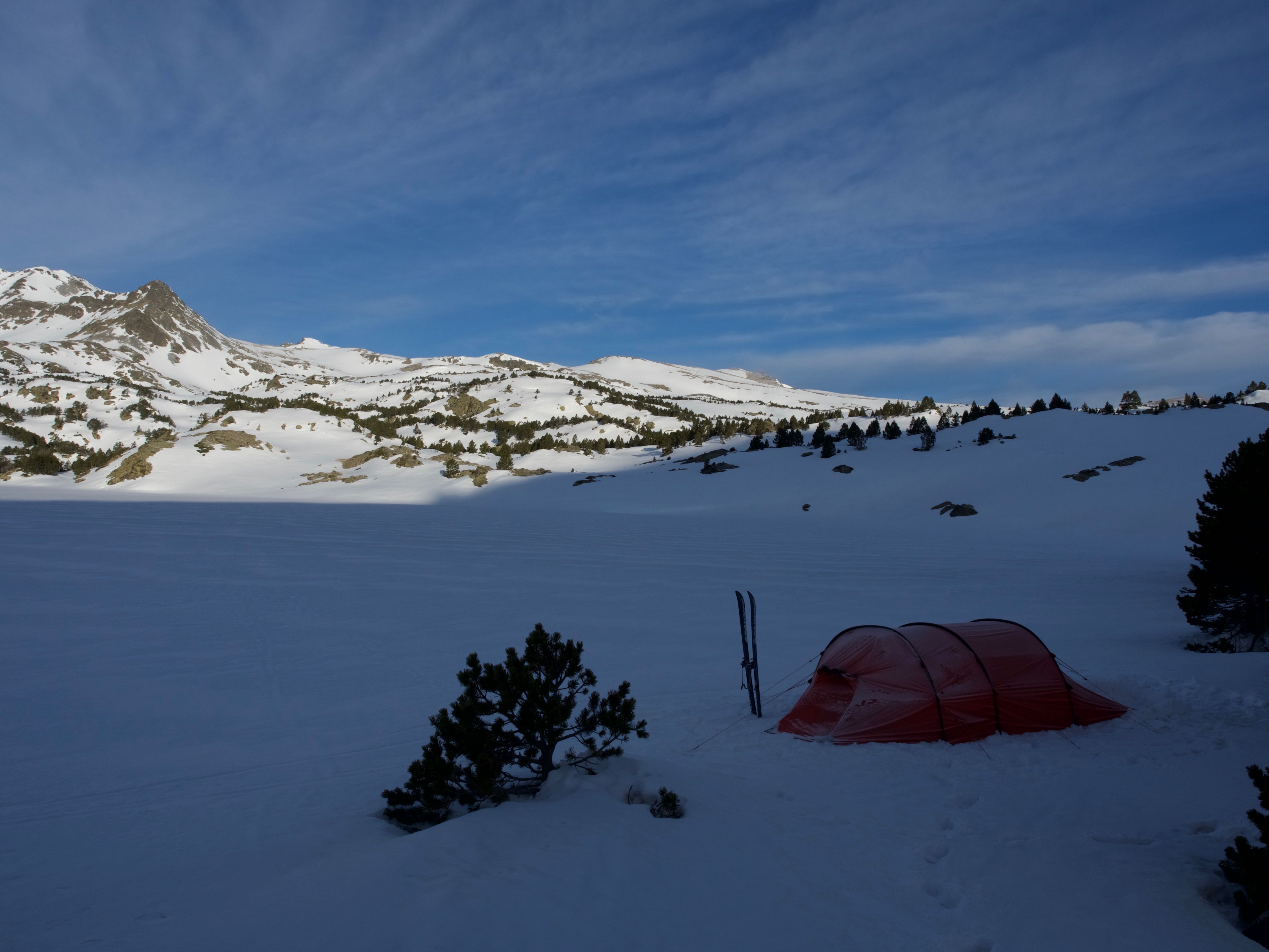 Descente ludique dans les sapins en direction de la pointe Nord du Lac des Bouillouses. Il faut frayer son chemin entre les arbres avec la pulka mais cela passe en y allant traquillement et visant les clairères. Quelques ponts de neige sur le ruisseau du Peric permettent de franchir le ruisseau de Peric sans encombre pour rejoindre le plat de la Têt dont il faut remonter la vallée. Ambiance nordique. Les pentes s'accentuent légèrement avant d'atteindre l'Estanyol dans le cirque au pied de la Portella de la Grava (2426m). J'y installe le bivouac en milieu d'après-midi puis monte vers la Portella pour découvrir le Lac Lanoux. Un autre secteur qui mériterait d'être exploré (peut-être même dans une traversée depuis l'Hospitalet par la vallée de Bessine). Retour au bivouac par une belle descente depuis le col de la Serra del Roig (2590m) qui réjouirait les as de la génuflexion. Je m'en tiens à mon style "ça-va-passer". Nuit sous les étoiles et sans vent.