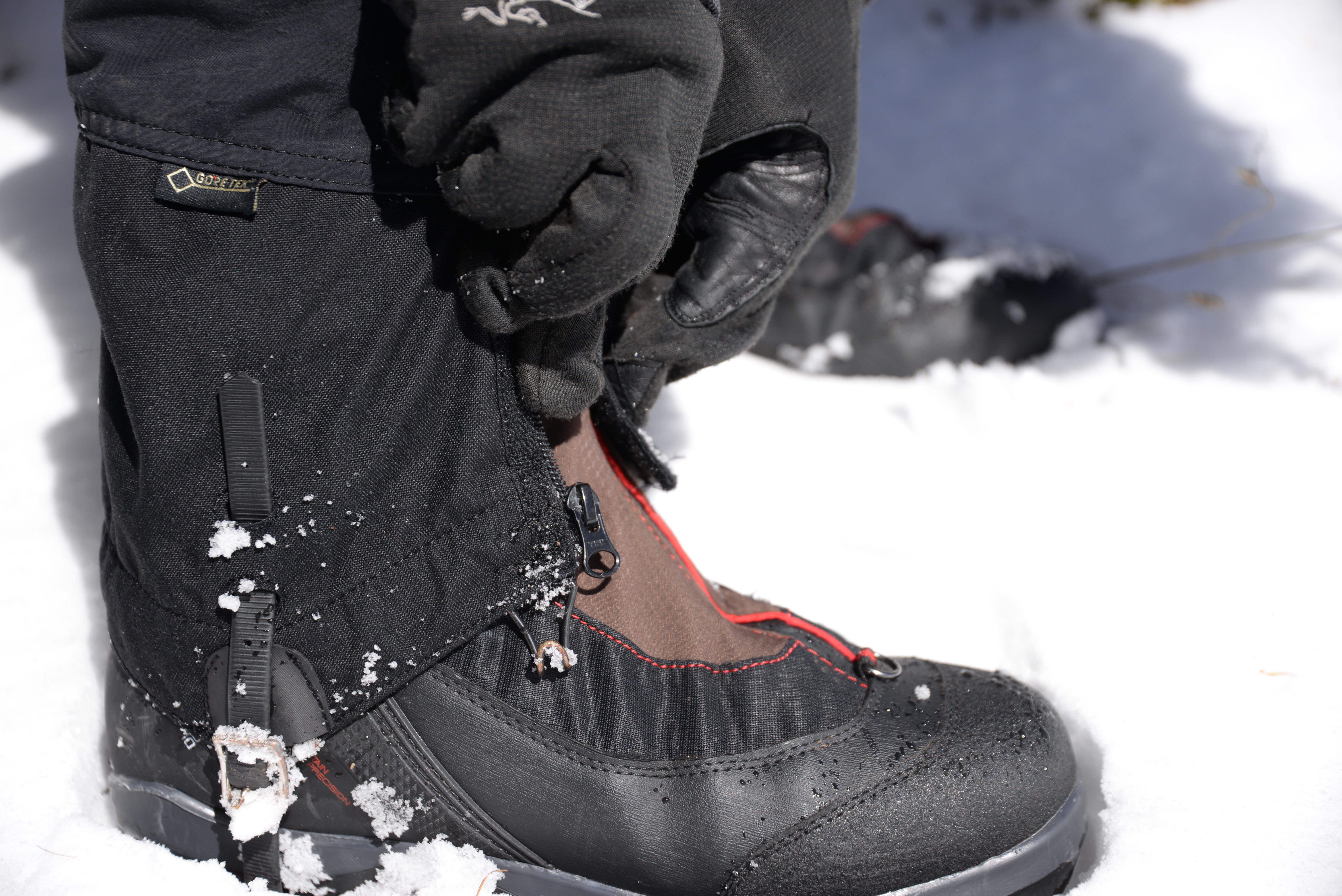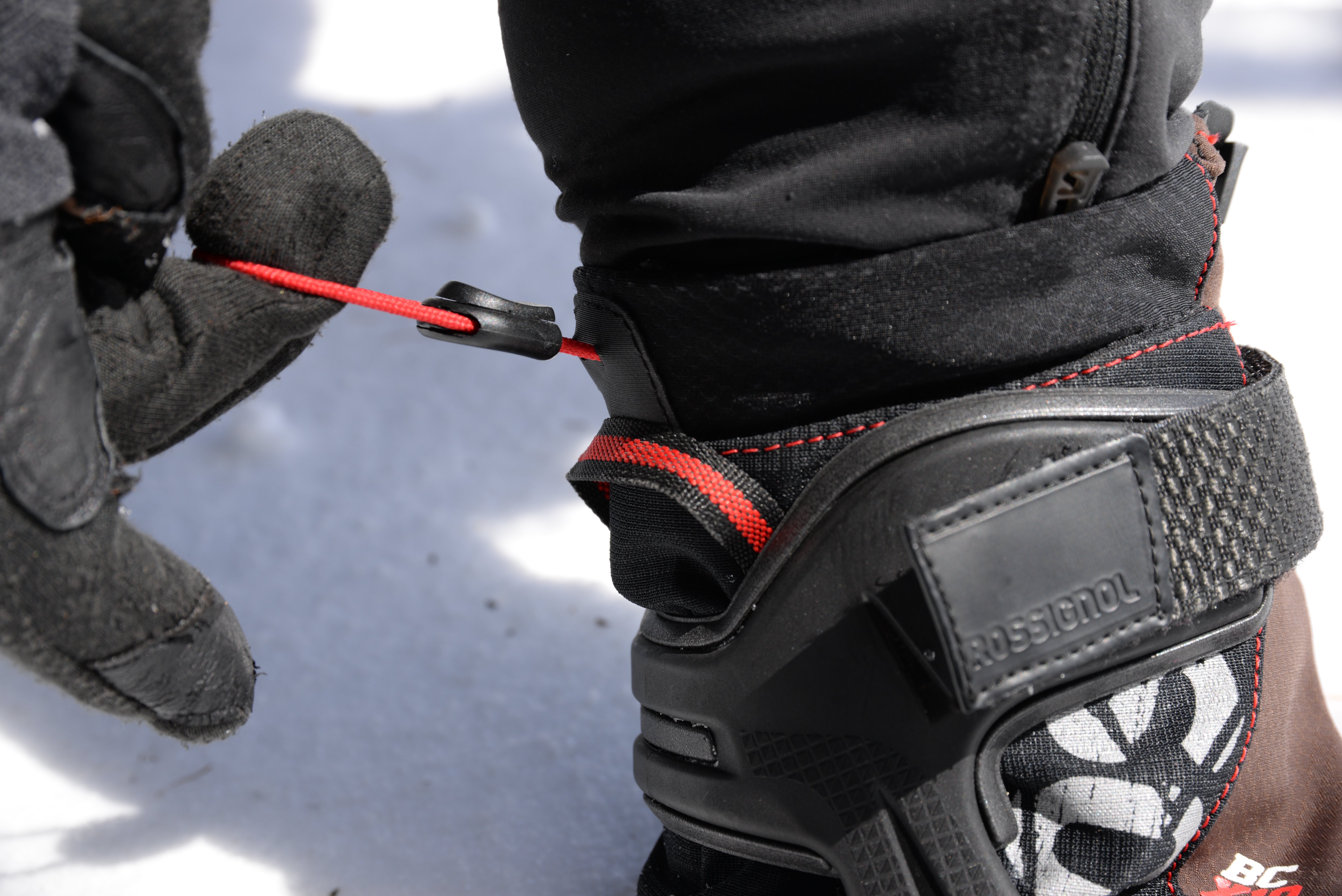 Une fois les lacets serrés à sa convenance, la guêtre se referme par la fermeture éclaire étanche et le chaussant se retrouve protégé des intempéries et durant les déplacements dans les neiges profondes. Un cordon de serrage est présent entre le mollet et la cheville pour éviter l’intrusion de la neige dans la chaussure.