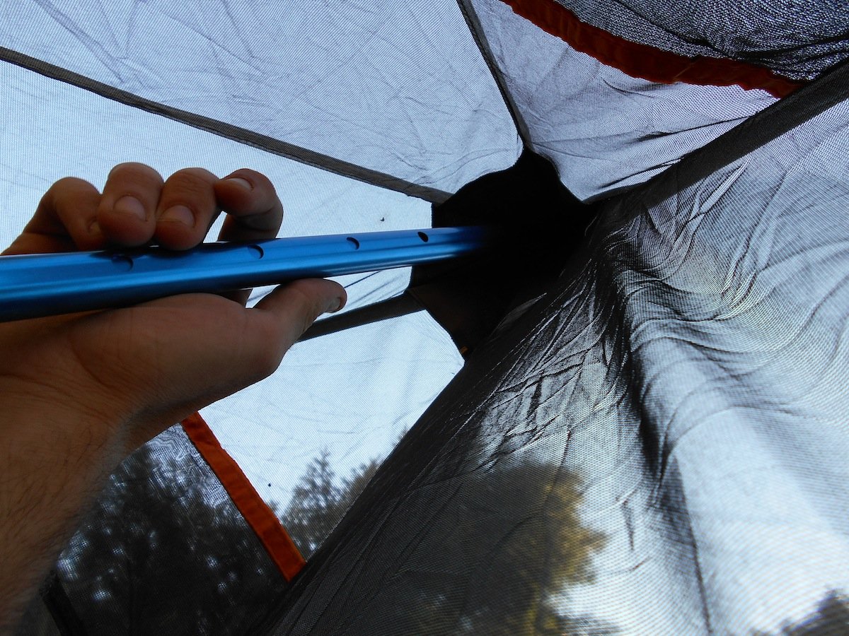 Pour mettre en place la chambre intérieure, il faut d'abord la poser au sol, puis la tendre à chacune de ses cinq extrémités avec les sardines. Ne pas hésiter à planter ces dernières le plus loin possible afin d'avoir du jeu pour ensuite régler correctement la tension à l'aide d'un système de cordelettes (très pratique à utiliser) et ainsi obtenir un pentagone. Attention, les sardines fournies avec la Sil Hexpeak F6 ne sont pas de très bonnes qualités : elles se plient et se casses assez facilement, y compris dans les sols tendres, dès lors que l'on force un peu et qu'on est pas très vigilent.