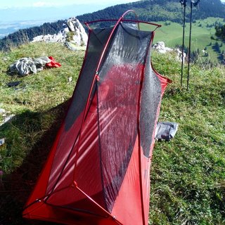 Le modèle testé est la Freelite 1, soit une tente d'un poids tout compris de 1 kg. Un argument des plus alléchants dès le premier abord ! En tant que possesseur d'une Hubba Hubba, le montage de la Freelite n'est pas déroutant puisqu'on retrouve l'arceau unique à plusieurs ramifications. L'assemblage tente intérieure/arceau est très rapide avec l'ajustement de 3 brins au niveau du sol que l'on complète avec l'ancrage de 4 sardines. Comme avec la Hubba Hubba, le brin supérieur de l'arceau, combiné à des crochets cousus sur la tente pour lui donner de la tension, permet de donner le volume intérieur de la tente.