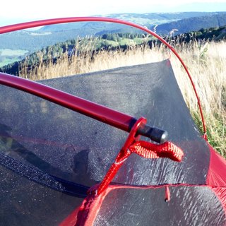 La mise en place de la tente extérieure ne pose pas plus de problème. L'ajustement se fait d'abord sur l'arceau : au niveau du sol avec les 2 brins de la partie destinée au buste et, spécificité MSR, avec le brin supérieur qui donne cette silhouette si particulière. Le montage se termine par une mise sous tension de l'ensemble tout à fait traditionnelle grâce à l'ancrage sur les 4 sardines. Au final, un montage simple, rapide et efficace très appréciable en conditions ventées ou pluvieuses.