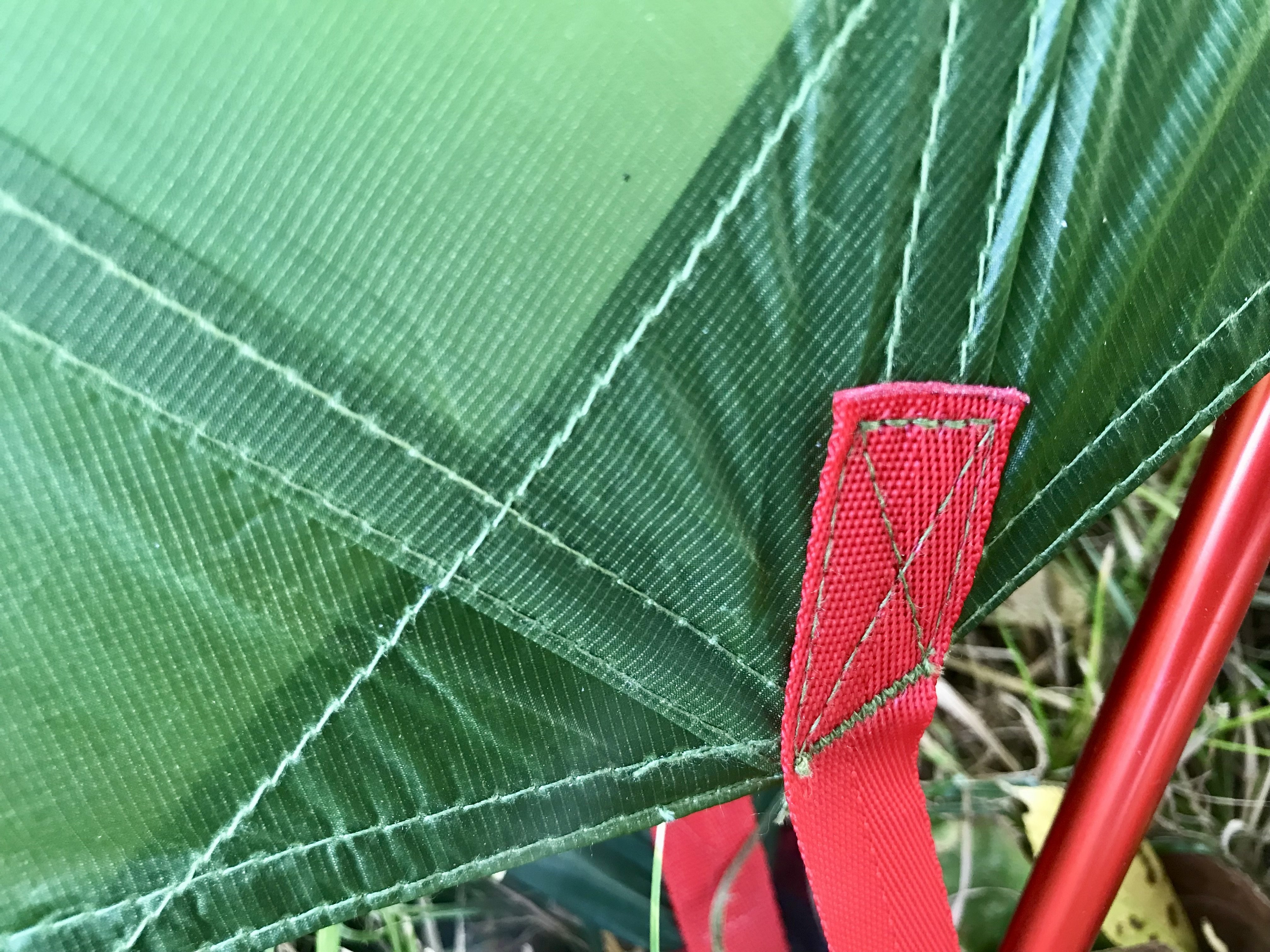 L'ensemble de la tension de la tente est ajusté par quatre boucles cousues dans les angles. Il suffit de les assurer sur les sardines et de régler la tension avec un brin qui coulisse et se bloque dans une boucle plastique.